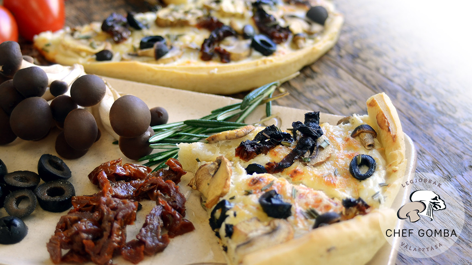 Mit Sauerrahm bestreichen, die kleingeschnittenen rohen Pilze, Oliven und getrockneten Tomaten darauf streuen mit ein wenig Rosmarin würzen.